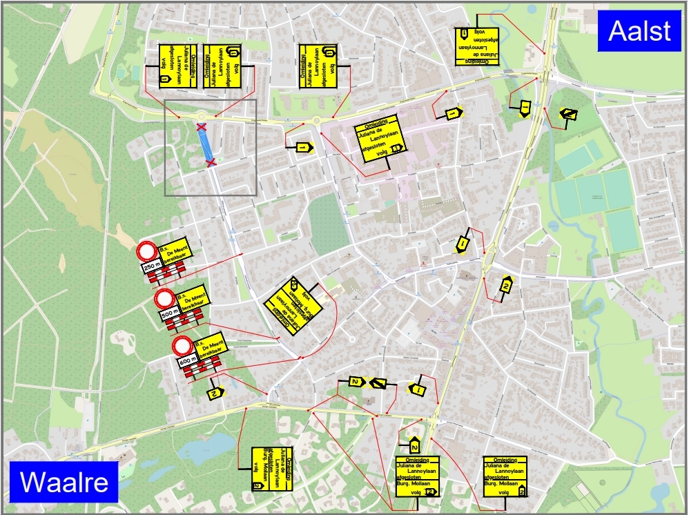 Vanwege werkzaamheden aan het riool is de Juliana de Lannoylaan, tussen de Alsemlaan en de Burgemeester Mollaan, op maandag 19 januari en dinsdag 20 januari volledig afgesloten voor gemotoriseerd verkeer.